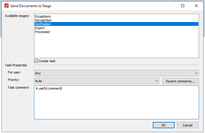 It's also possible to send different documents to different stages. Some might already be exported so these could be sent to Processed (the 'parking' stage which is at the end of the process), some could go to Verification for one user, others go to Exceptions (again) with a useful comment for IT support/administrator who may be expected to action them.
