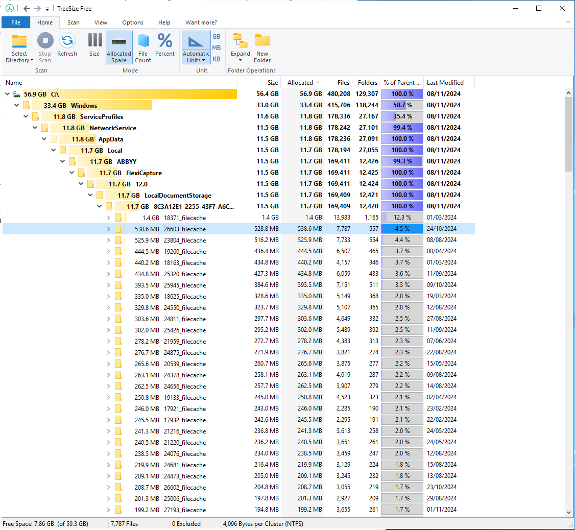 Workaround: If the ABBYY FlexiCapture Processing Station service is temporarily stopped on the server then the LocalDocumentStorage folder can be deleted; it will be recreated by the service when next run.